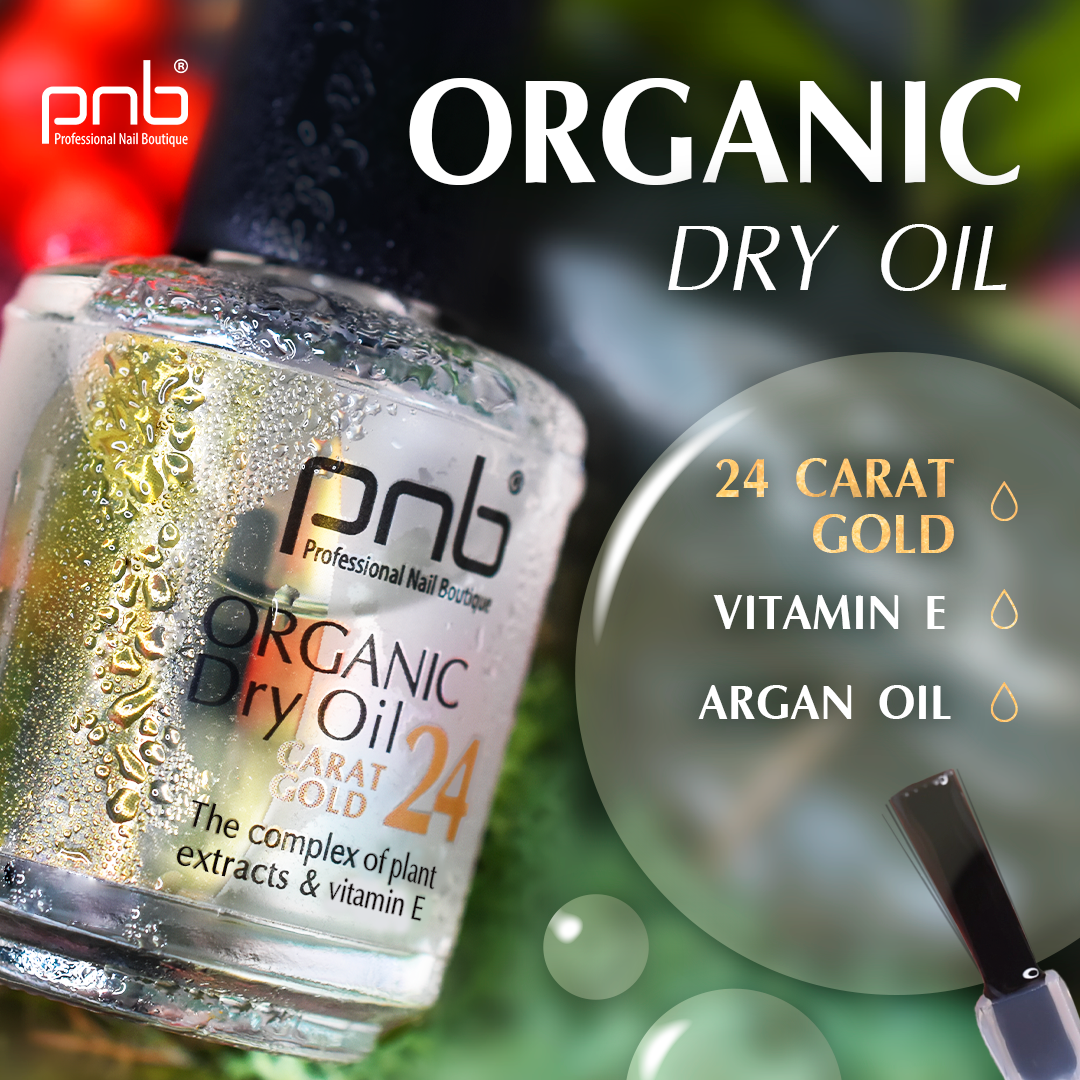 - Живлення та догляд. Унікальна формула Organic Dry Oil PNB містить високу концентрацію живильних компонентів, які підтримують здоров'я кутикули, покращуючи її стан та сприяючи росту здорових нігтів. А присутність елементів 24-каратного золота у складі надають шкірі фантастичного вигляду.